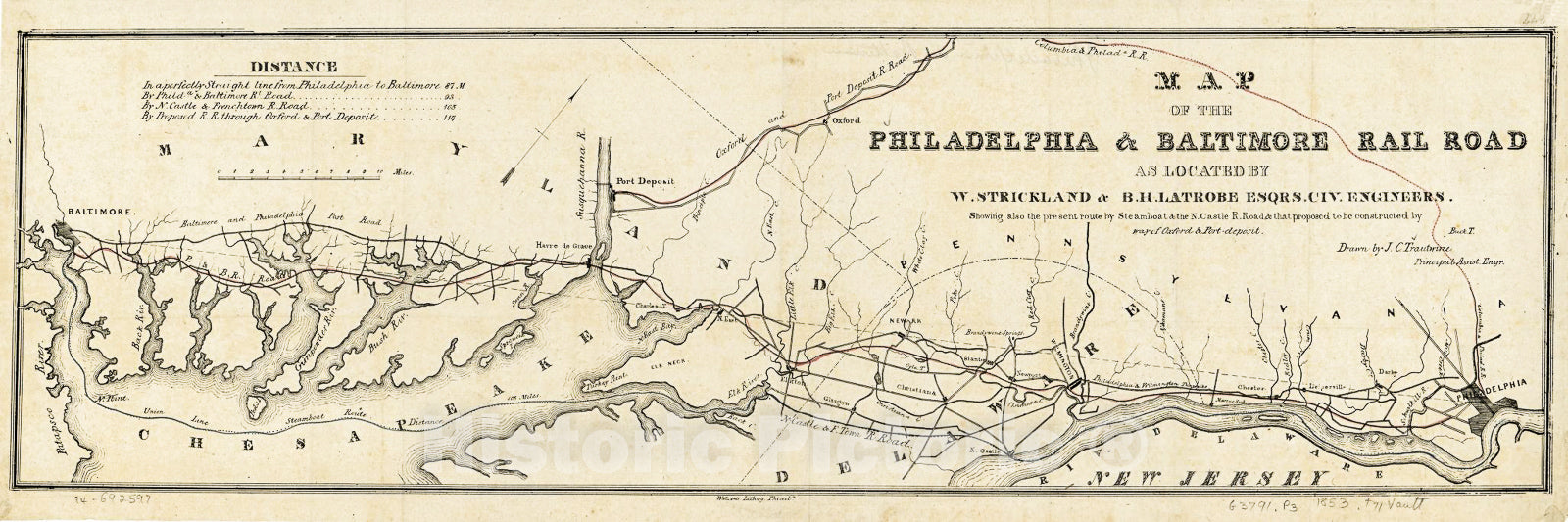 Historic 1853 Map - Map of The Philadelphia & Baltimore Rail Road as Located by W. Strickland & B. H. Latrobe, Esqrs, civ. Engineers. 2