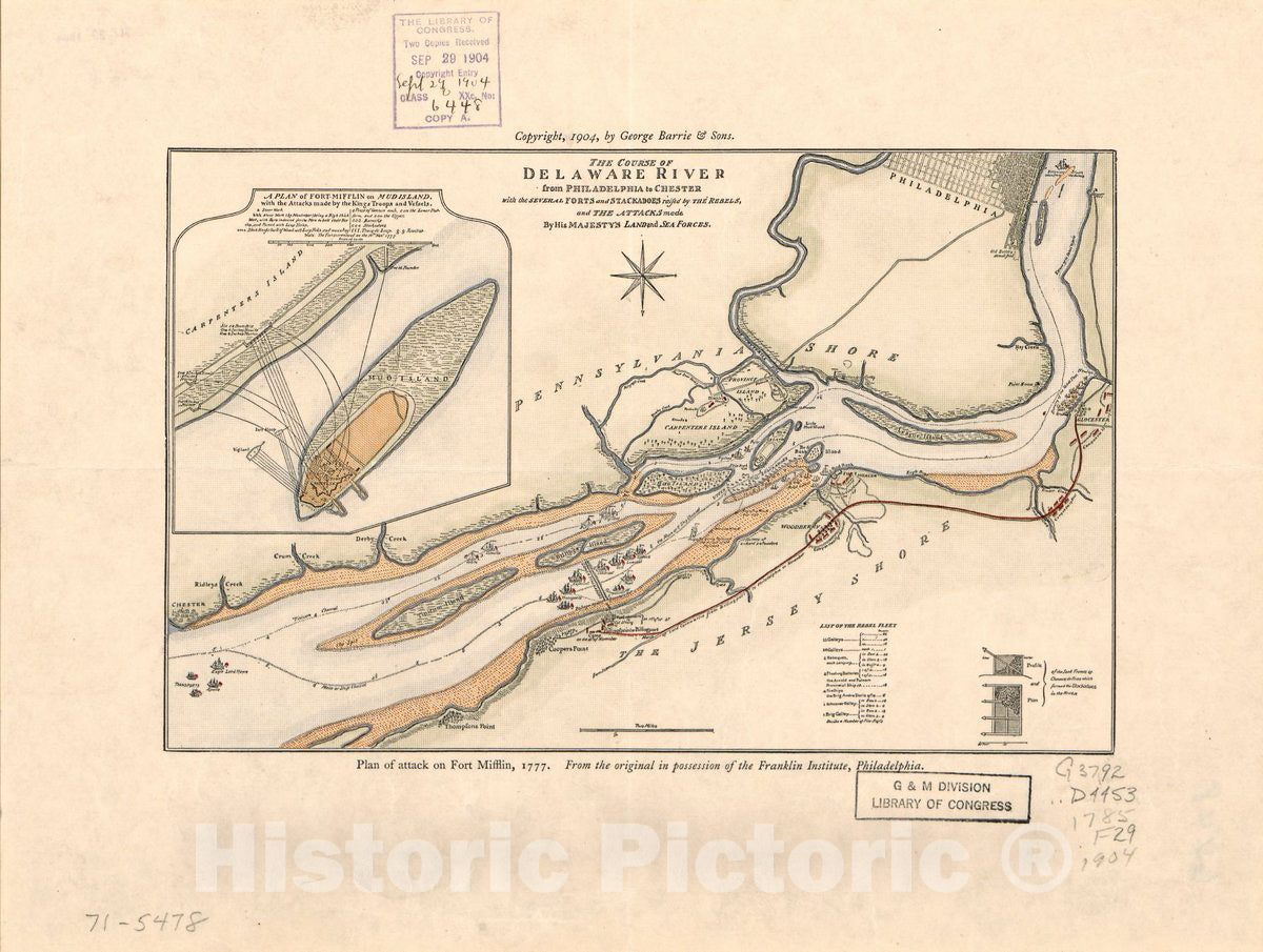 Historic 1904 Map - The Course of Delaware River from Philadelphia to Chester with The Several forts and stackadoes Raised by The Rebels, and The Attacks Made by His Majesty's Land