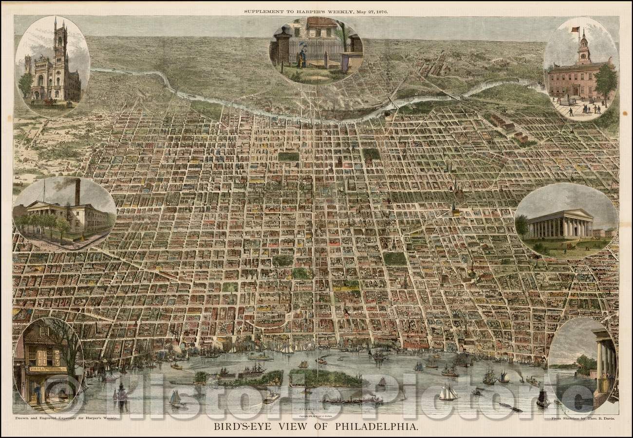 Historic Map - Bird's Eye View of Philadelphia, 1872, Harper's Weekly - Vintage Wall Art
