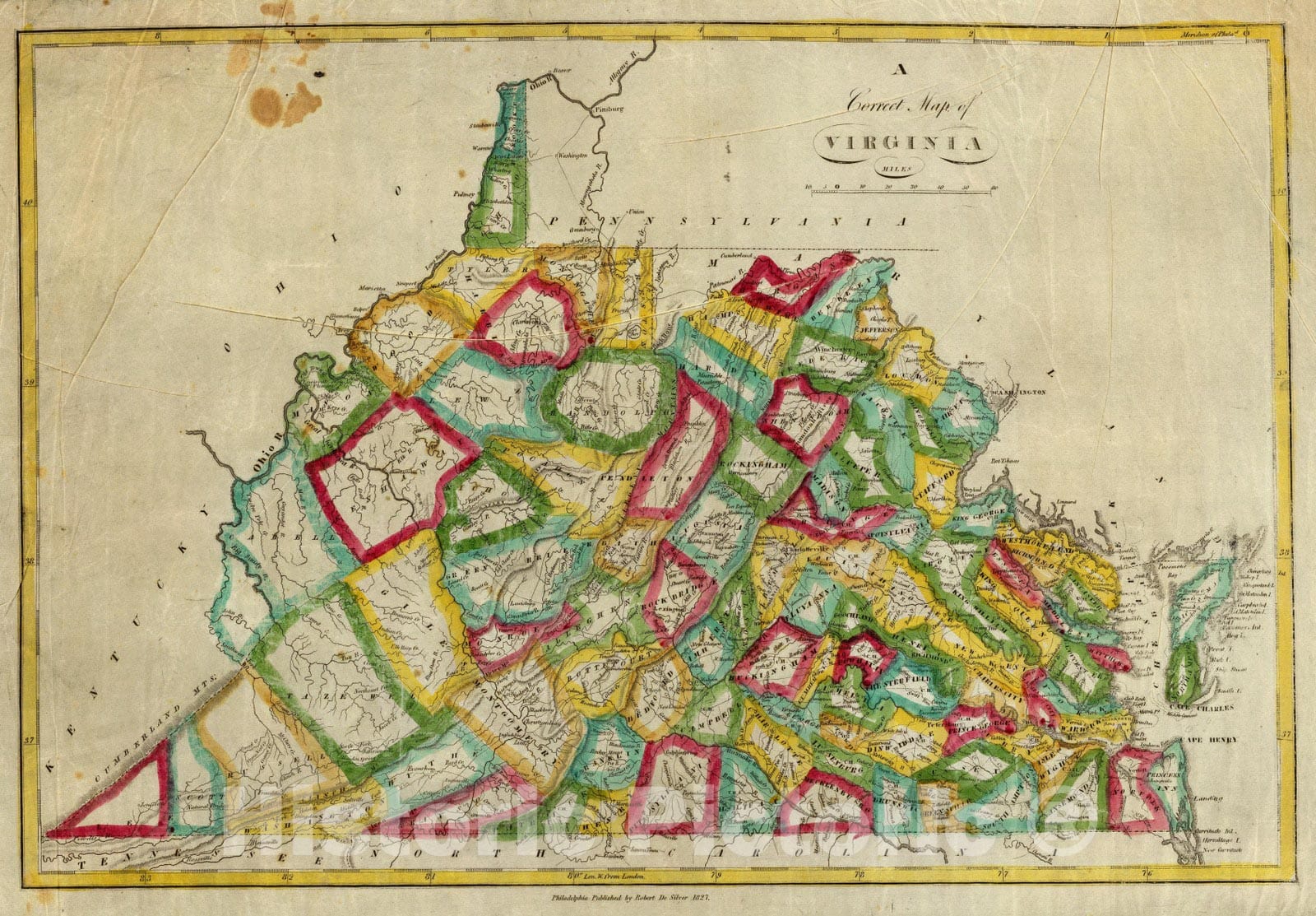 • .Historic Map : A correct map of Virginia. Philadelphia: Published by Robert De Silver, 1827. - Vintage Wall Art