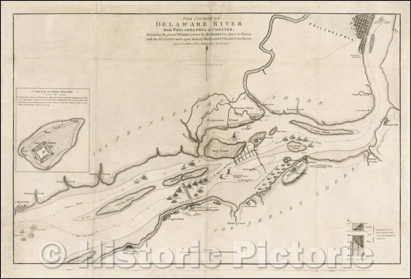 Historic Map - The Course of Delaware River from Philadelphia to Chester, 1778, William Faden - Vintage Wall Art