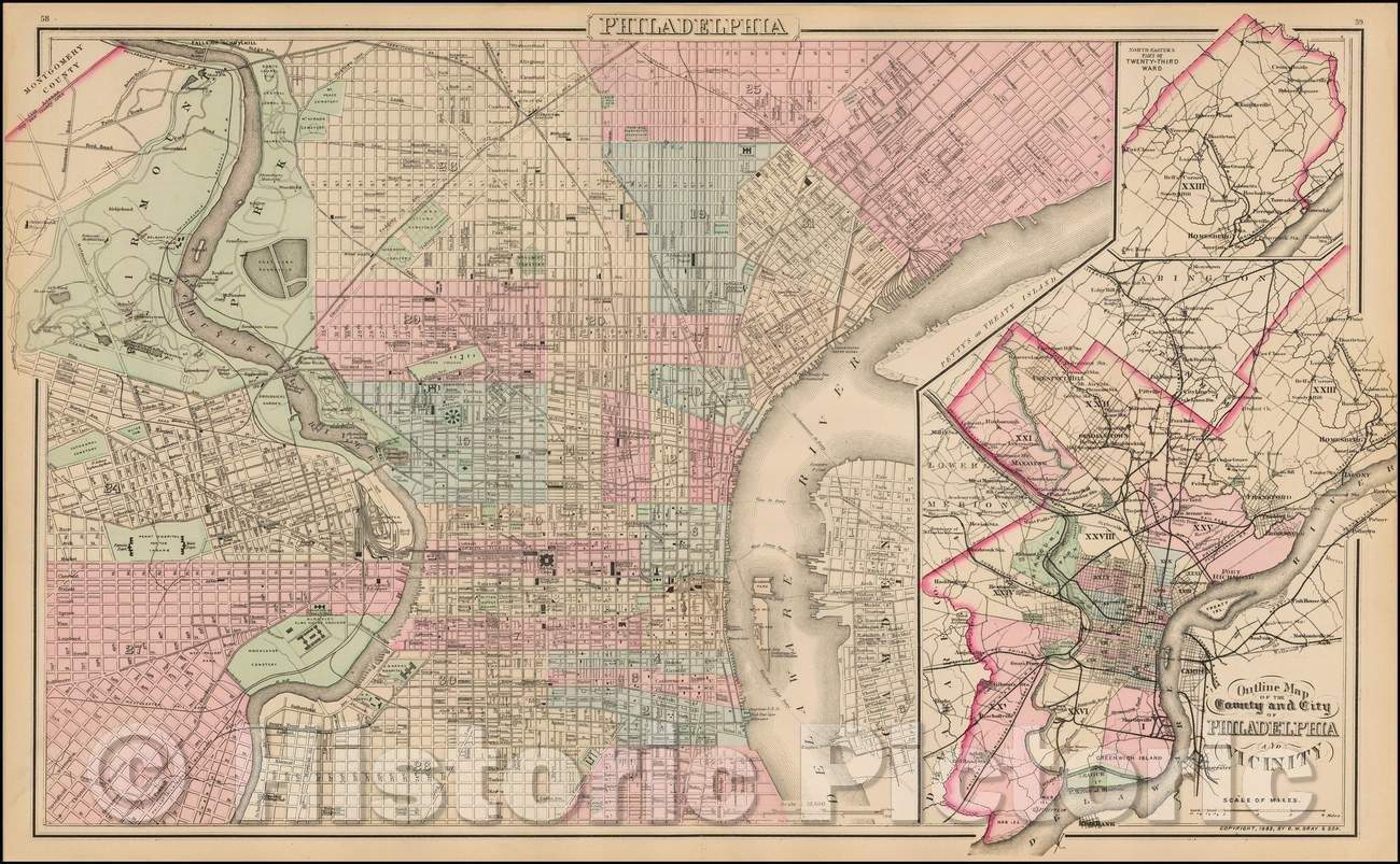 Outline Map of the County and City of Philadelphia and Vicinity [with] Philadelphia, 1873, O.W. Gray