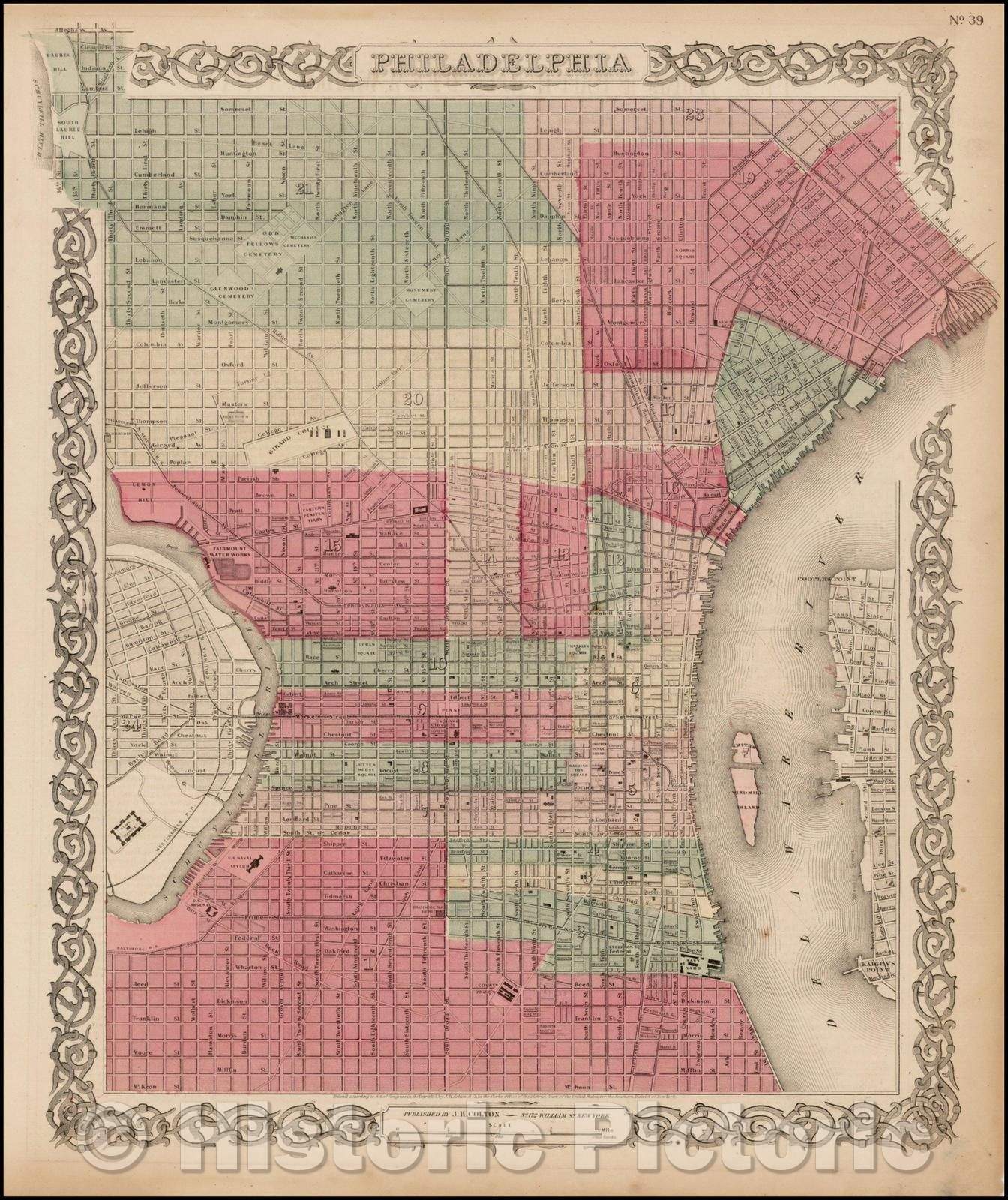 Historic Map - Philadelphia, 1856, Joseph Hutchins Colton - Vintage Wall Art