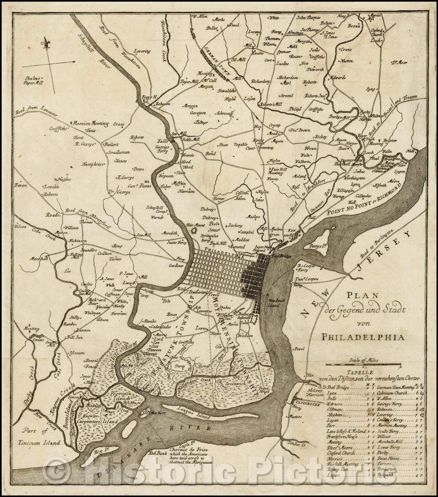 Historic Map - Plan der Gegend und Stadt von Philadelphia/Map of the area and the city of Philadelphia, 1778, Gabriel Nikolaus Raspe - Vintage Wall Art