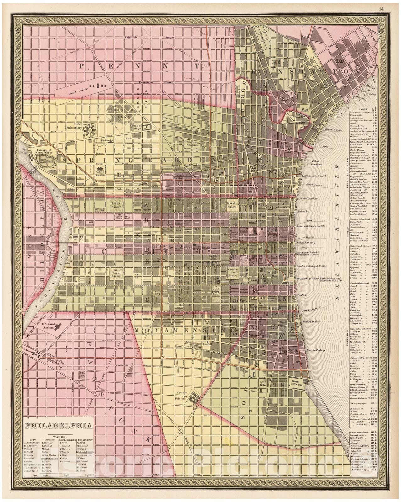 This scarce hand colored map is a lithographic plan or map of Philadelphia dating to 1846 by the legendary American Mapmaker S.A. Mitchell, the elder. Depicts the entire city in stupendous detail with even important buildings, streets, piers, and canal