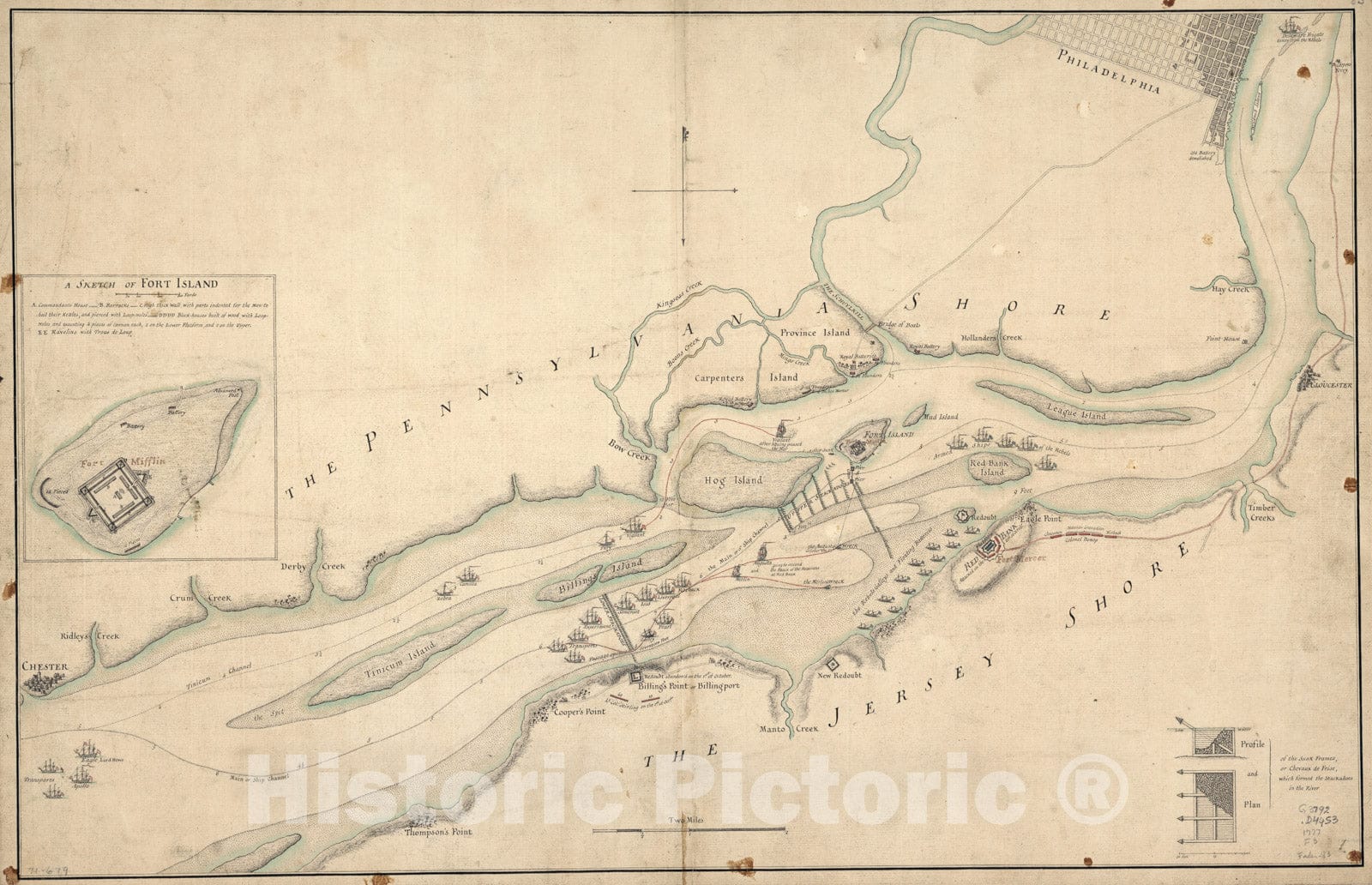Historical Map, 1777 The Course of Delaware River from Philadelphia to Chester, exhibiting The Several Works erected by The Rebels to Defend its Passage, Vintage Wall Art