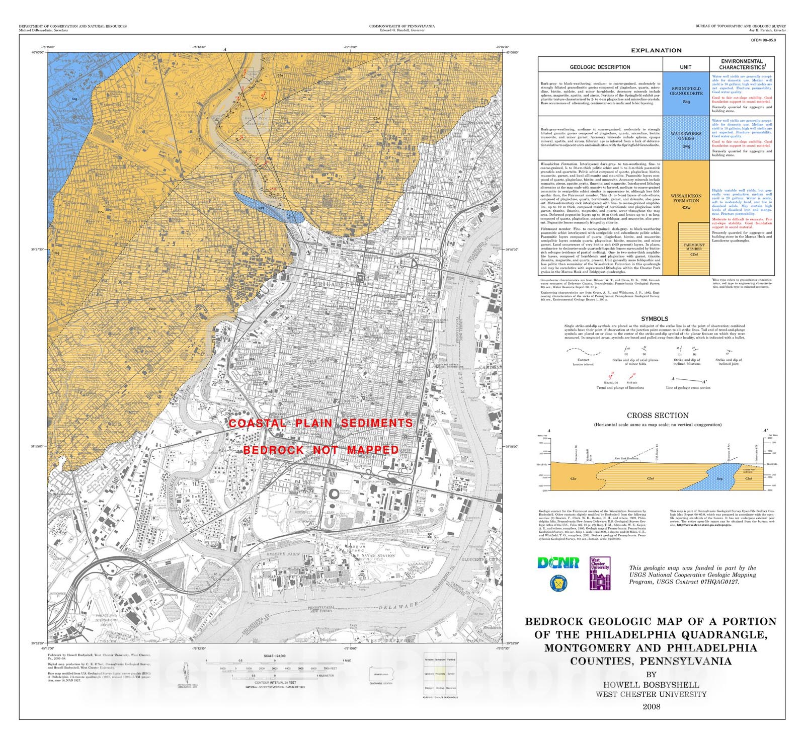 Map : Bedrock geologic map of a portion of the Philadelphia quadrangle, Montgomery and Philadelphia Counties, Pennsylvania, 2008 Cartography Wall Art :