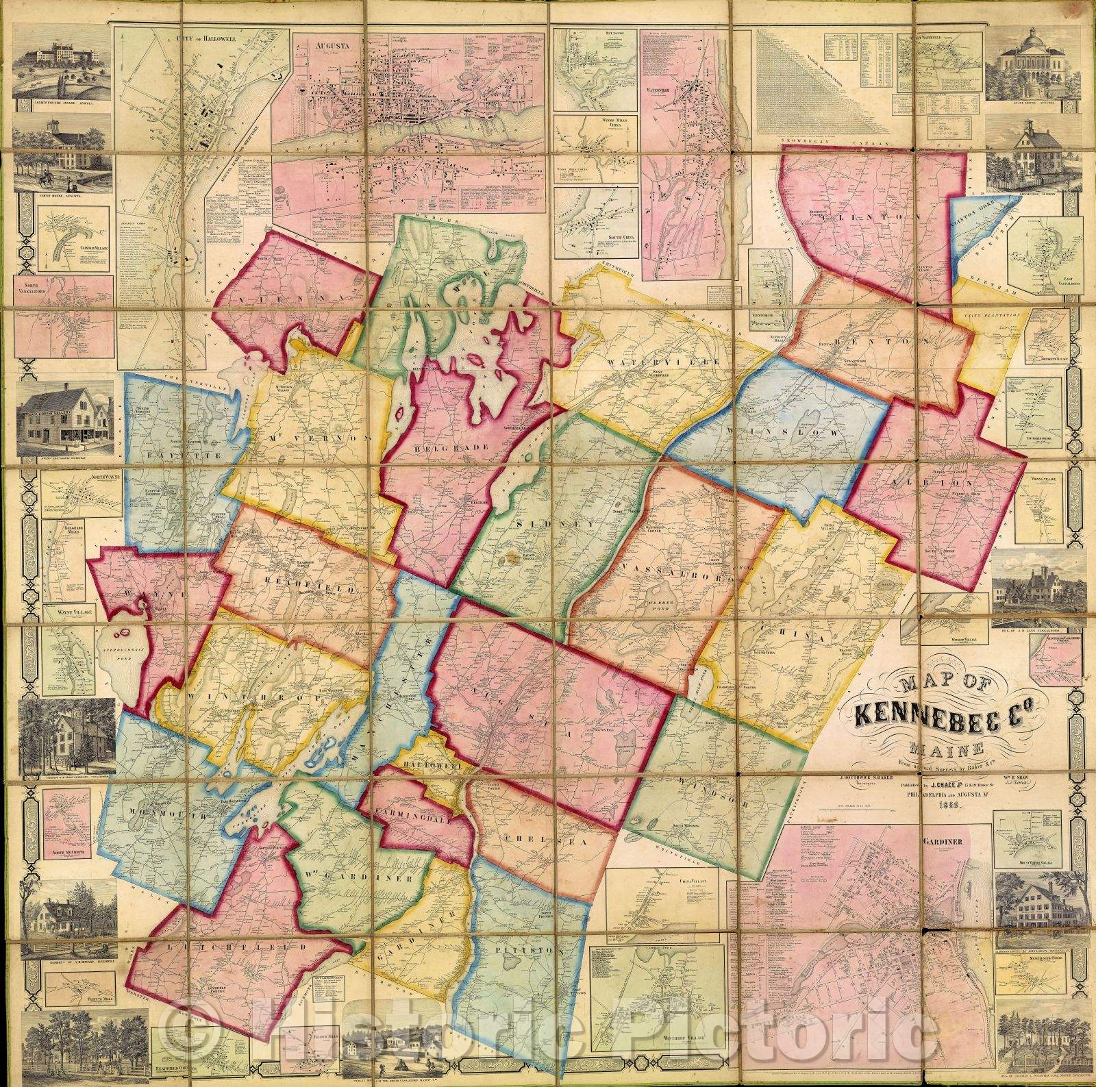 Historic Map : Map of Kennebec Co. Maine from actual surveys by Baker and Co. Published by J. Chace Jr. 17 and 19 Minor St. Philadelphia and Augusta Me. 1856., 1856 , Vintage Wall Art