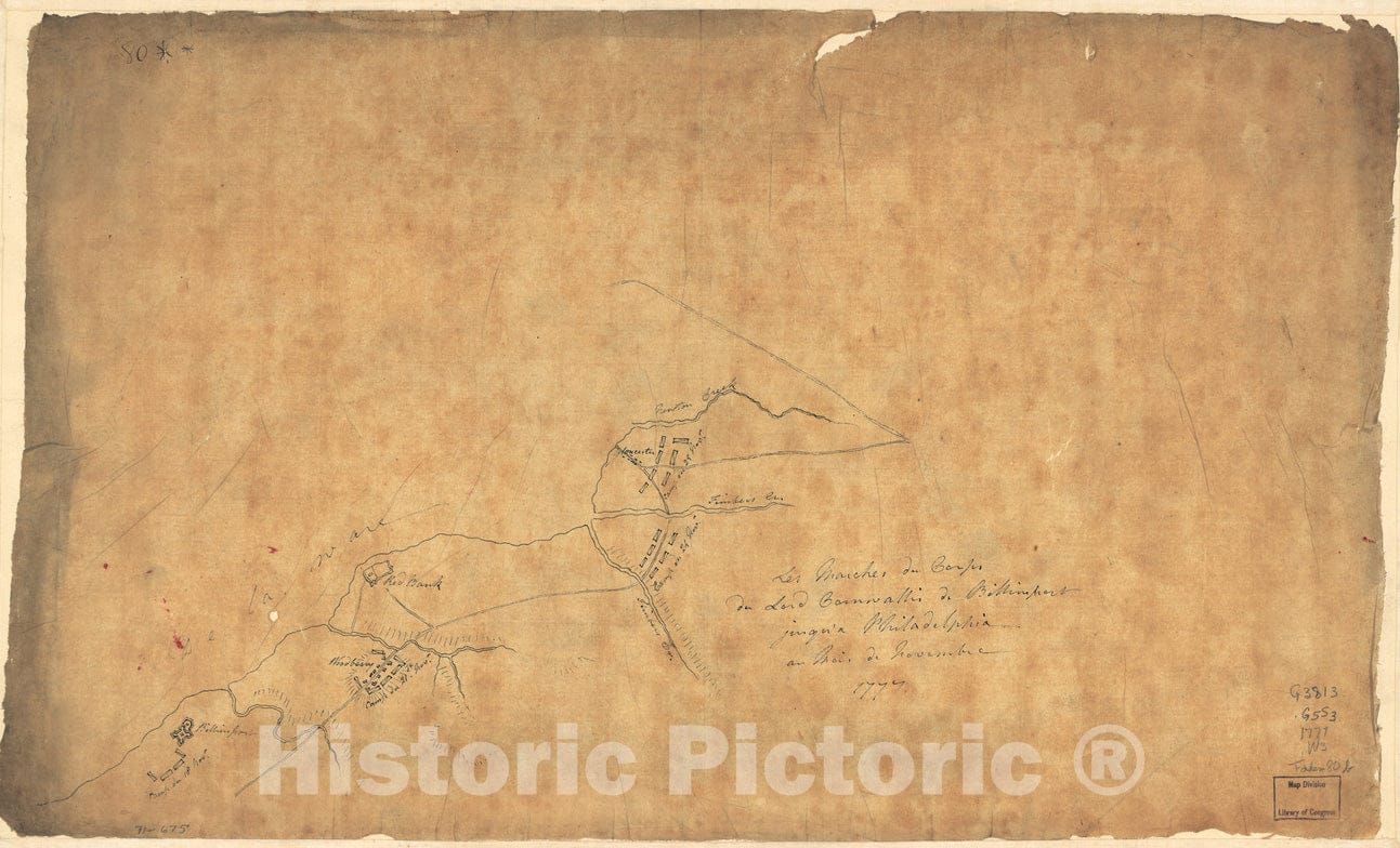 Historical Map, Les marches du Corps du Lord Cornwallis de Billinsport jusqu'a Philadelphia au Mois de Novembre, 1777, Vintage Wall Art