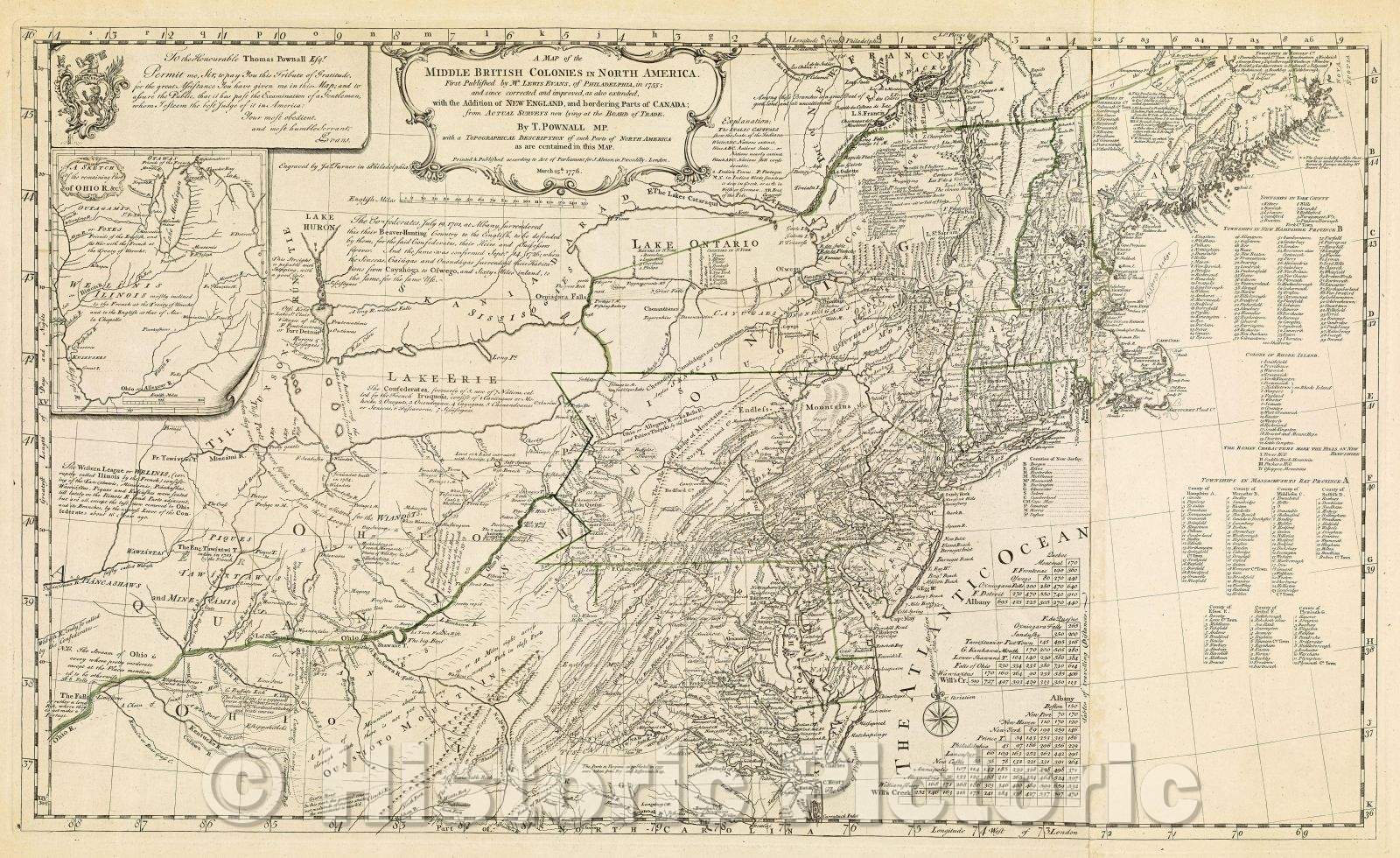 • .Historic Map : A Map of the Middle British Colonies in North America. First published by Mr. Lewis Evans, of Philadelphia, in 1755, 1776 , Vintage Wall Art