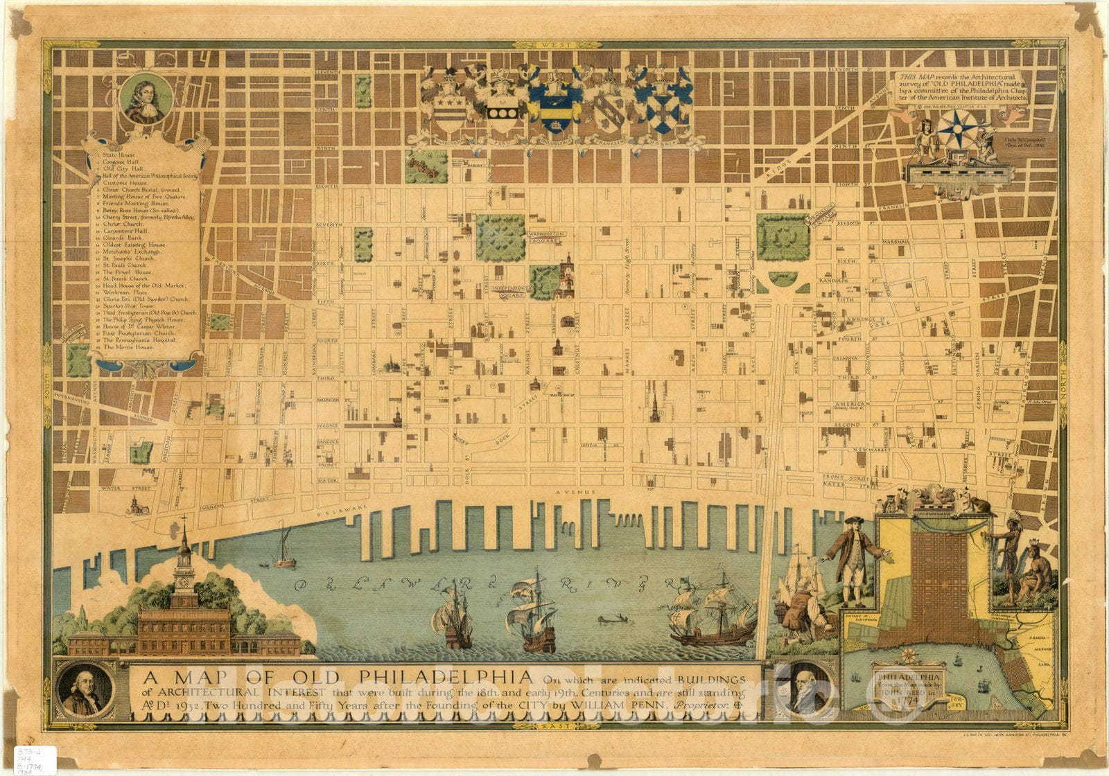 A map of old Philadelphia, on which are indicated buildings of architectural interest that were built during the 18th and early 19th centuries and are still standing Ao. Di. 1932 : two hundred and fifty years after the founding of the city by William P