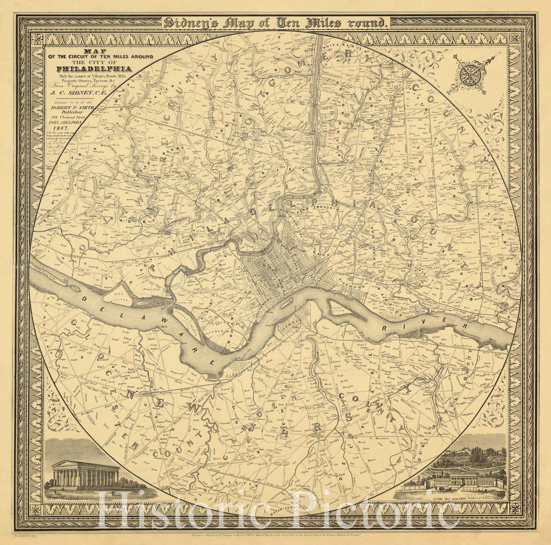 Historic Map : Philadelphia, Pennsylvania 1847, Map of the circuit of ten miles around the city of Philadelphia : with the names of villages, roads, mills, property owners, taverns
