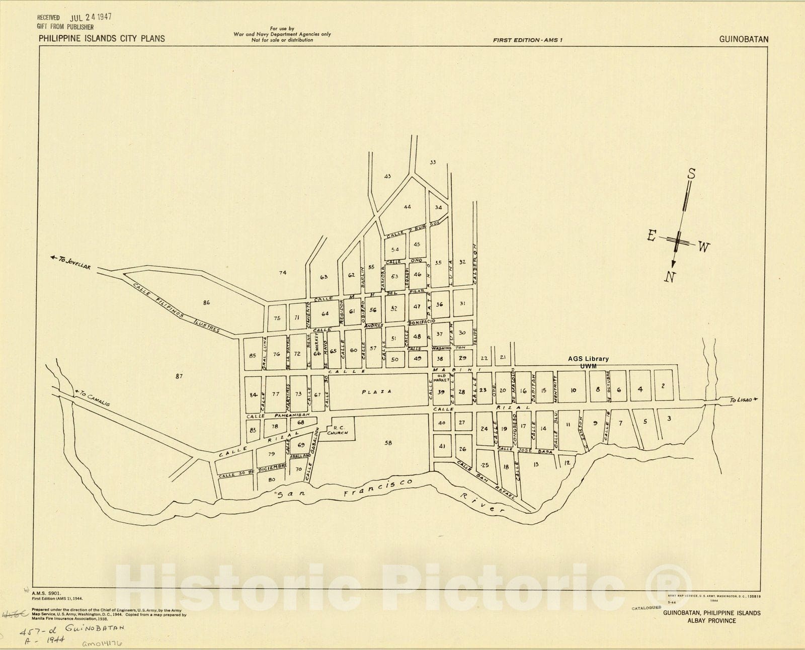 Map : Guinobatan, Philippines 1944, Guinobatan, Philippine Islands, Albay Province, Antique Vintage Reproduction