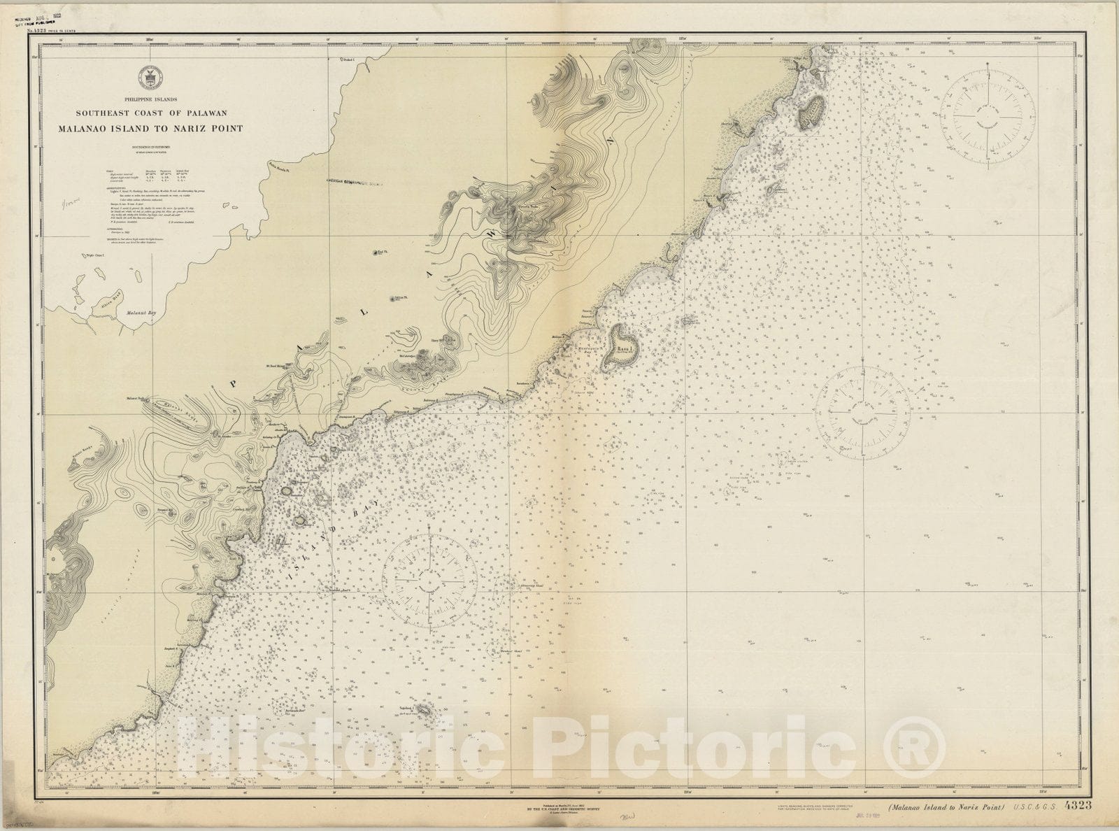 • Map : Malanao Island to Nariz Point, Philippines 1922, Philippine Islands, southeast coast of Palawan : Malanao Island to Nariz Point , Antique Vintage Reproduction