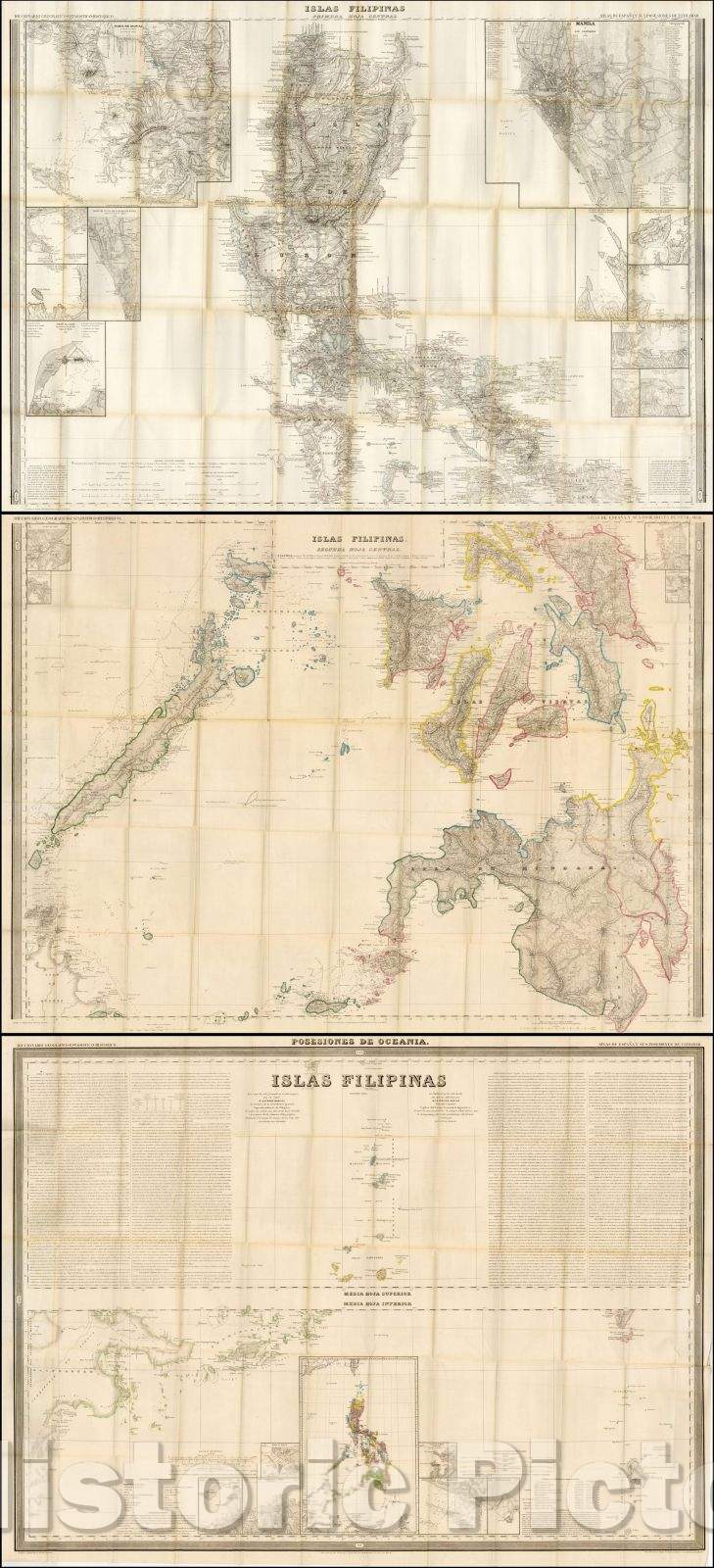 • .Historic Map - 3 Part Map of the Philippines: Islas Filipinas Primera Hoja Central and Islas Filipinas Segunda Hoja Central and Islas Filipinas Posesiones, 1849 - Vintage Wall Art