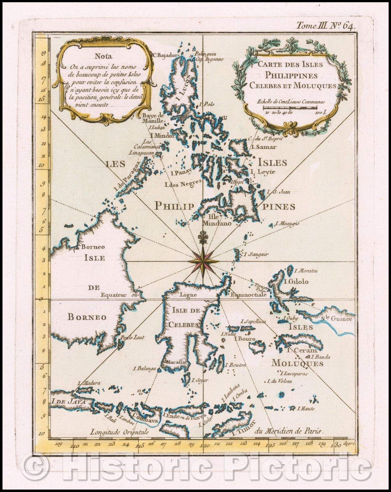 • .Historic Map - Carte Des Isles Philippines Celebes et Moluques/Carte et Des Isles Philippines Celebes Moluccas, 1764, Jacques Nicolas Bellin - Vintage Wall Art