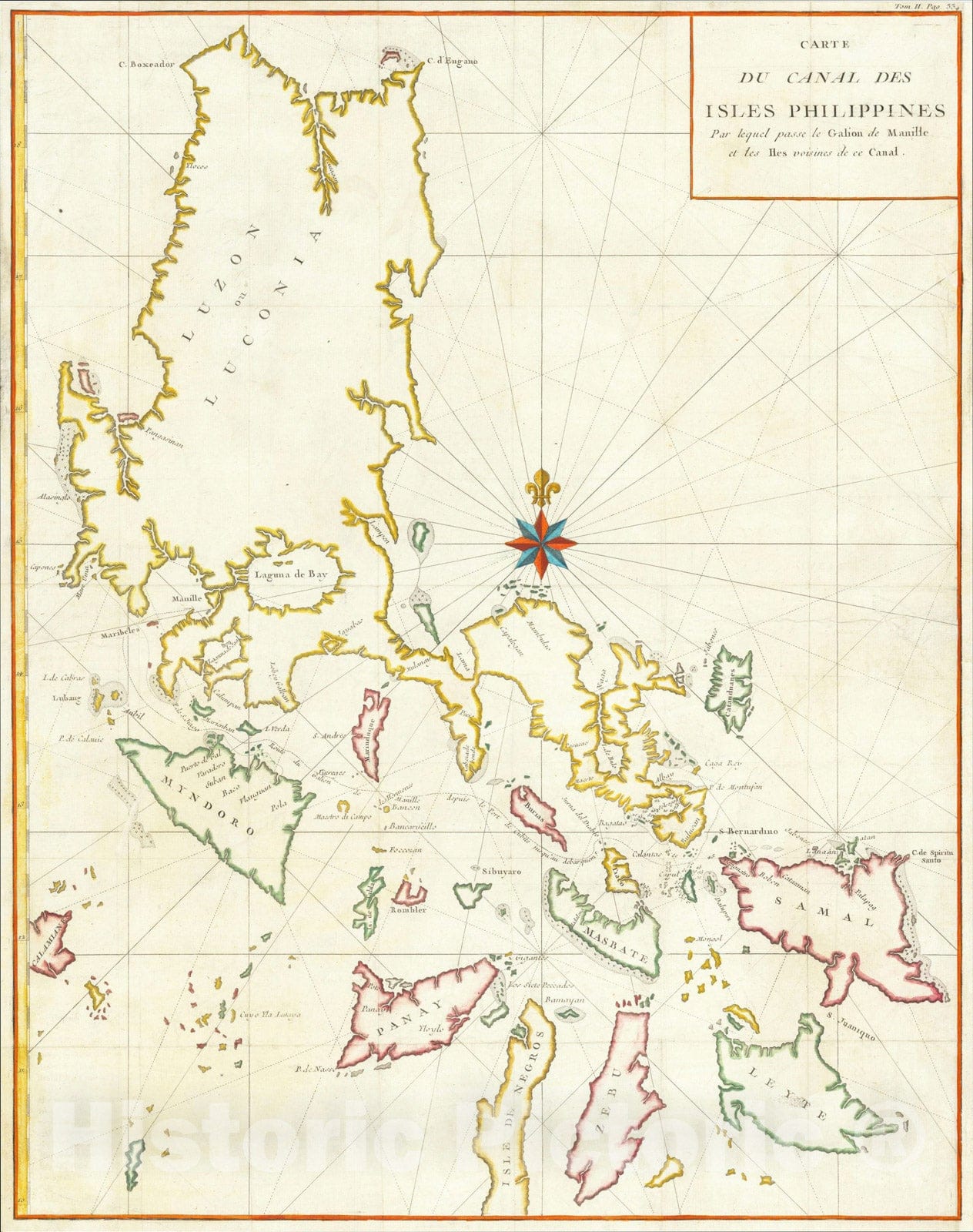 • .Historic Map : Carte du Canal des Isles Philippines Par leque passe le Galion de Manille. Et les Iles voisines de ce canal., 1748, George Anson, Vintage Wall Art
