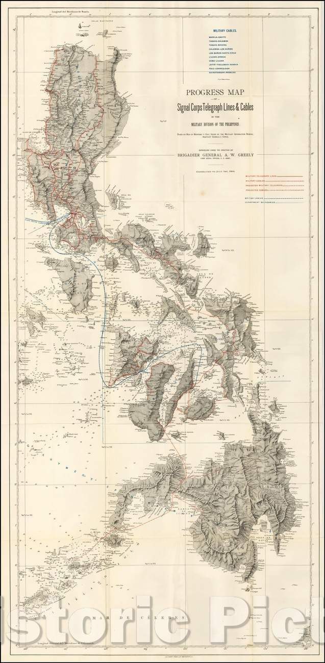 • .Historic Map - Progress Map of Signal Corps Telegraph Lines & Cables In The Military Division of the Philippines, 1900, United States Dept. of the Navy - Vintage Wall Art