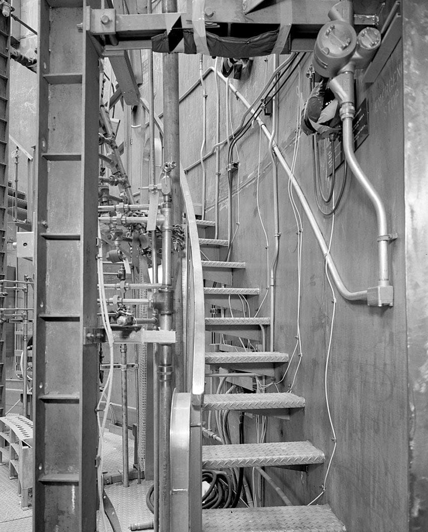 DETAIL OF WALL-MOUNTED STAIRS ON INTERIOR OF ALTITUDE CHAMBER L, FACING SOUTHWEST - Cape Canaveral Air Force Station, Launch Complex 39, Altitude Chambers, First Street, between Avenue D and Avenue E, Cape Canaveral, Brevard County, FL
