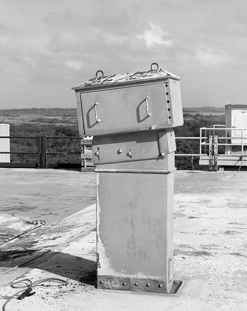 DETAIL VIEW OF A CAMERA PEDESTAL ON THE BLAST DECK OF THE 0 LEVEL - Cape Canaveral Air Force Station, Launch Complex 39, Mobile Launcher Platforms, Launcher Road, East of Kennedy Parkway North, Cape Canaveral, Brevard County, FL