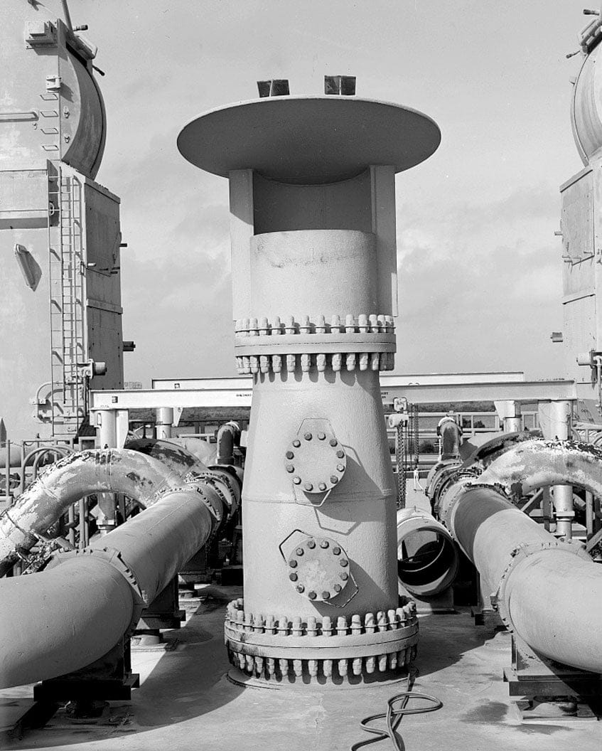 DETAIL VIEW OF THE SOUND SUPPRESSION SPRAY NOZZLE POSITIONED BETWEEN THE TWO SRB EXHAUST OPENINGS - Cape Canaveral Air Force Station, Launch Complex 39, Mobile Launcher Platforms, Launcher Road, East of Kennedy Parkway North, Cape Canaveral, Brevard County, FL