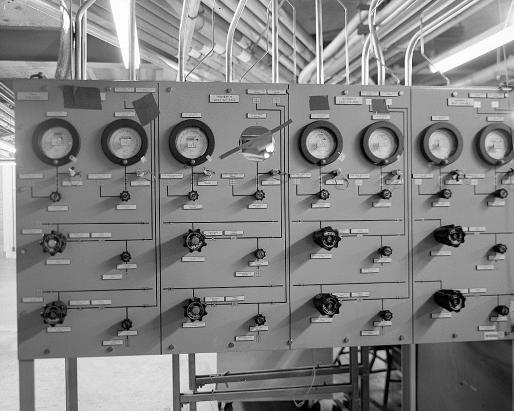 DETAIL OF THE EXTERNAL TANK PNEUMATIC CONTROL PANELS FOR HB-2 AND HB-4, SECOND LEVEL OF THE EXTERNAL TANK CHECK-OUT CELLS, HB-2, FACING EAST - Cape Canaveral Air Force Station, Launch Complex 39, Vehicle Assembly Building, VAB Road, East of Kennedy Parkway North, Cape Canaveral, Brevard County, FL