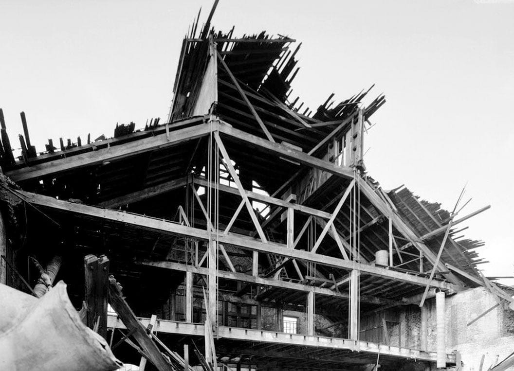 5. Close-up view looking N showing structural framing of partially demolished Machine Shop - Central of Georgia Railway, Savannah Repair Shops & Terminal Facilities, Machine Shop, Bounded by West Broad, Jones, West Boundary & Hull Streets, Savannah, Chatham County, GA