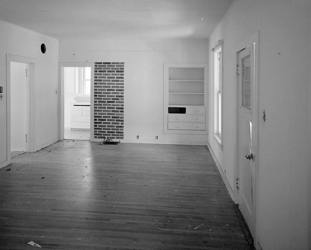 11. LIVING ROOM INTERIOR SHOWING BUILT-IN CUPBOARD AND OPEN DOOR TO KITCHEN ON THE NORTH WALL AT PHOTO CENTER. OPEN DOOR ON WEST WALL AT PHOTO LEFT ENTERS NORTH BEDROOM. VIEW TO NORTH. - Big Creek Hydroelectric System, Big Creek Town, Operator House, Orchard Avenue south of Huntington Lake Road, Big Creek, Fresno County, CA