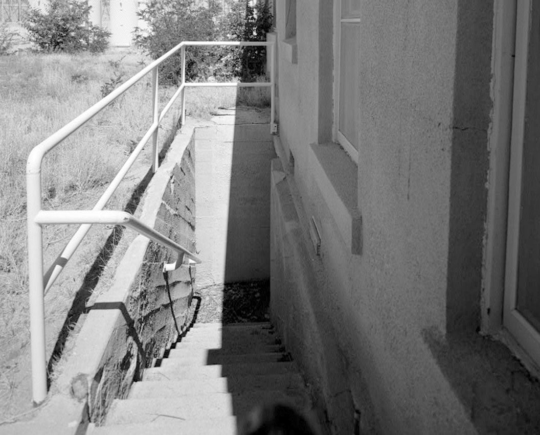 7. TOP OF STAIRWAY TO SOUTH SIDE BASEMENT DOOR. VIEW TO WEST. - Bishop Creek Hydroelectric System, Control Station, Operations Building No. 1, Bishop Creek, Bishop, Inyo County, CA