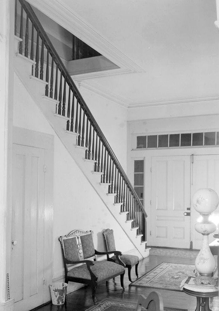 14. Historic American Buildings Survey Alex Bush, Photographer, November 14, 1936 LOOKING S. E. IN SOUTH CROSS HALL SHOWING STAIR AND DOOR ON EAST WALL AND ENTRANCE DOOR - Cedar Grove, Uniontown Road, Faunsdale, Marengo County, AL