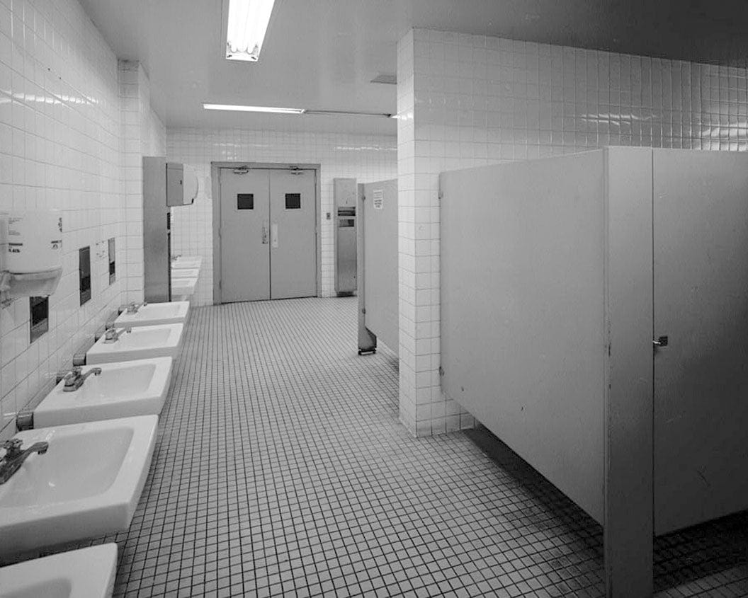 53. Looking southwest, Men's bathroom - City Post Office, 2 Massachusetts Avenue, Northwest, Washington, District of Columbia, DC