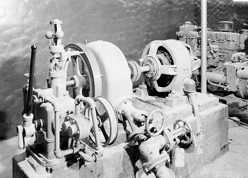 19. POWER ROOM INTERIOR, PELTON WATER TURBINE AND FLYBALL GOVERNOR DIRECTLY CONNECTED TO 7 KW AC GENERATOR (ON RIGHT), 125 VOLTS, 56 AMPS. INSTALLED IN 1926, STILL IN USE FOR OUTSIDE LIGHTING. - Death Valley Ranch, Power House, Death Valley Junction, Inyo County, CA
