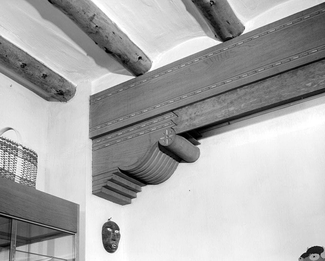 49. INTERIOR, FIRST FLOOR, MAIN CORRIDOR, ROOM 1023, INDIAN ARTS AND CRAFTS SHOP, DETAIL OF DECORATIVE BEAM, CORBEL, AND CEILING - U.S. Department of the Interior, Eighteenth & C Streets Northwest, Washington, District of Columbia, DC