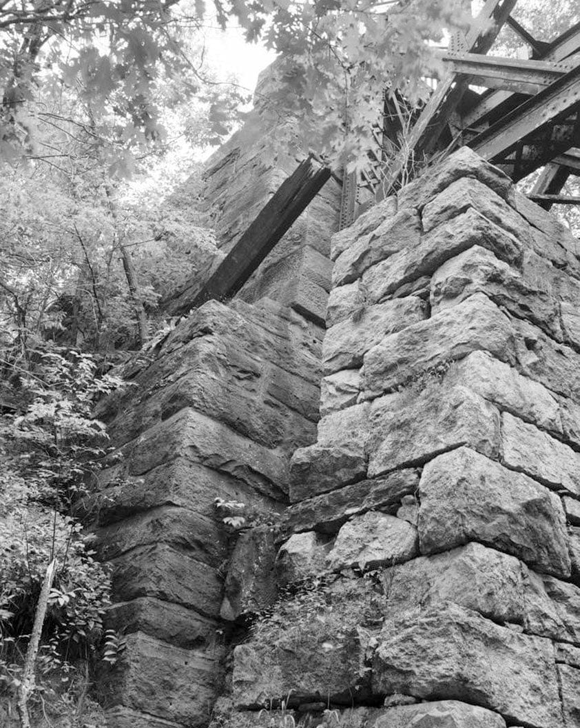 8. VIEW OF NORTHWEST CORNER OF EAST ABUTMENT: NOTE STONE PLATFORM ON RIGHT. - Double Intersection Warren Truss Bridge, Spanning Blackledge River, Colchester, New London County, CT