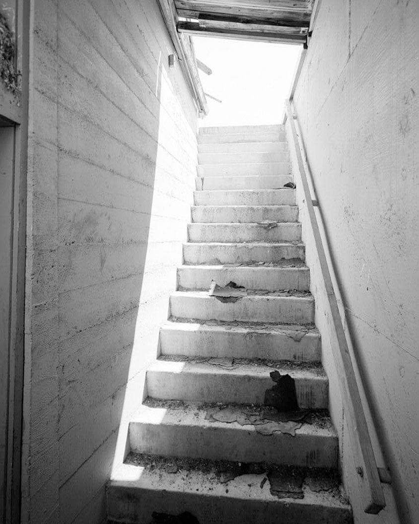 4. Credit BG. Interior detail view of entry stairs at southwest end of Deluge Water Pumping Station. The left wall has a slight curve. - Edwards Air Force Base, North Base, Deluge Water Pumping Station, Near Second & D Streets, Boron, Kern County, CA