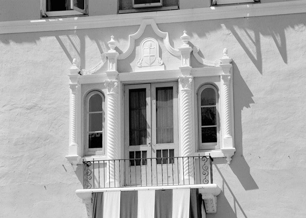 8. DETAIL, BALCONY DOOR AND SIDE LIGHTS OVER CANOPY AT SOUTH (REAR) ENTRANCE - Everglades Club, Palm Beach, Palm Beach County, FL