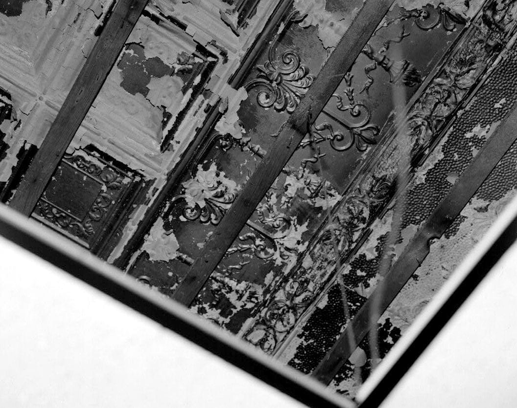 6. Interior, first floor front room. View of pressed metal ceiling visible through opening in dropped ceiling. (Below the pressed metal ceiling are three wooden joists, two electrical wires and the edges of the dropped ceiling where a panel had been removed). - Ferree Building, 417 Ninth Street, Northwest, Washington, District of Columbia, DC