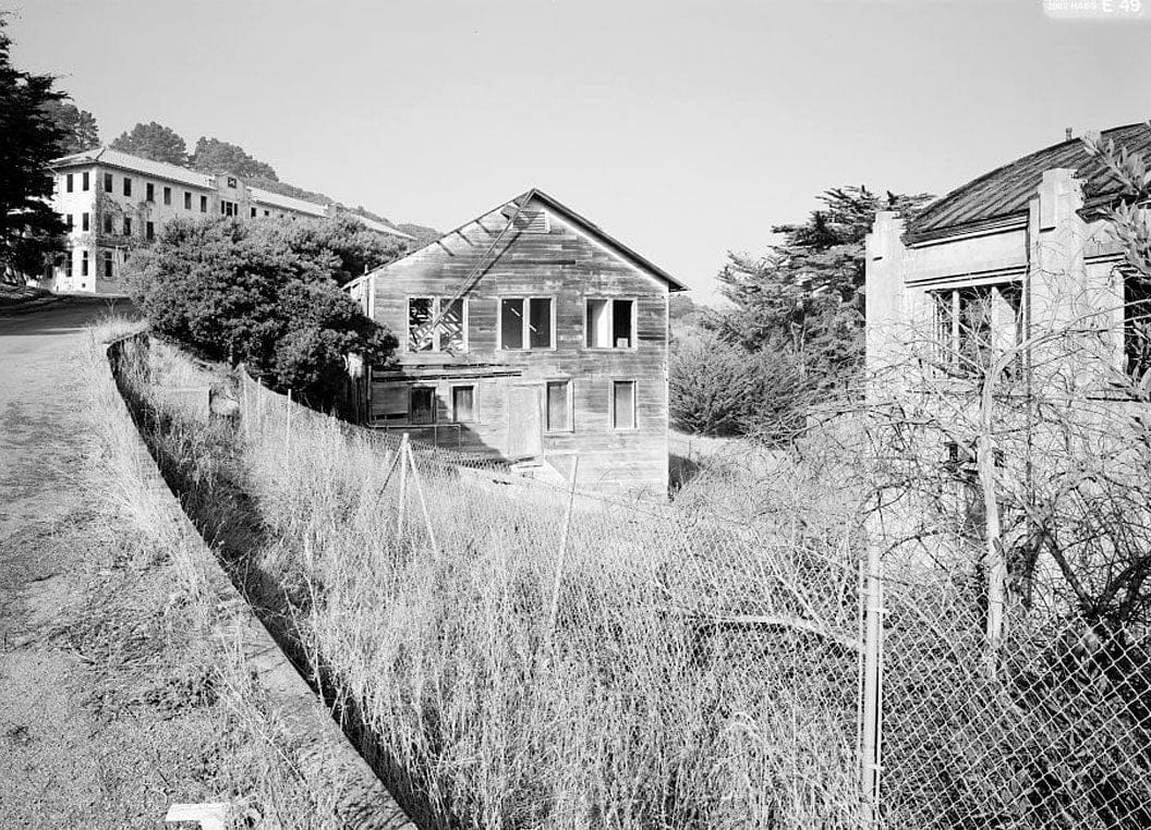View looking northwest, of (left to right) hospital, finance & signal building, and mess & drill hall - Fort McDowell, Angel Island State Park, Angel Island, Marin County, CA