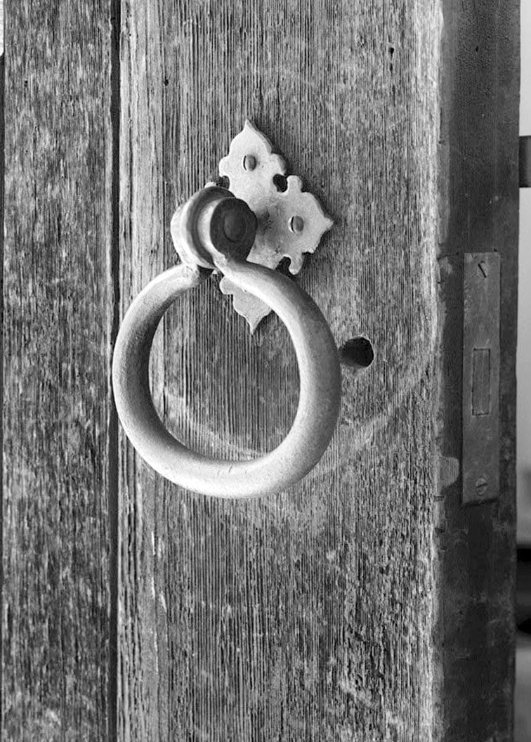 6. SOUTHEAST FRONT, DETAIL OF DOOR KNOCKER - Glenn & Ida May Moore Rowhouse, 6126 Paseo Delicias, Rancho Santa Fe, San Diego County, CA