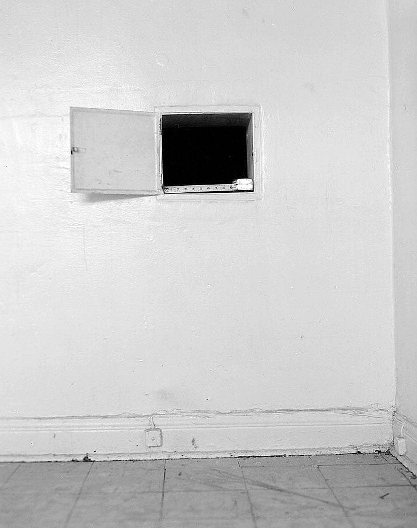 7. INTERIOR VIEW OF KITCHEN WALL SHOWING PASS THROUGH AND BASEBOARD - Golda Meir House, 1606-1608 Julian Street (moved to 1301 South Lipan Street), Denver, Denver County, CO