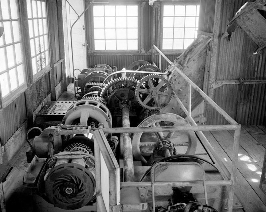 53. Drive shaft, motors, eddie currents, brakes, and differential gears in south machinery room (interior of both machinery rooms is identical). Facing east. - Henry Ford Bridge, Spanning Cerritos Channel, Los Angeles-Long Beach Harbor, Los Angeles, Los Angeles County, CA