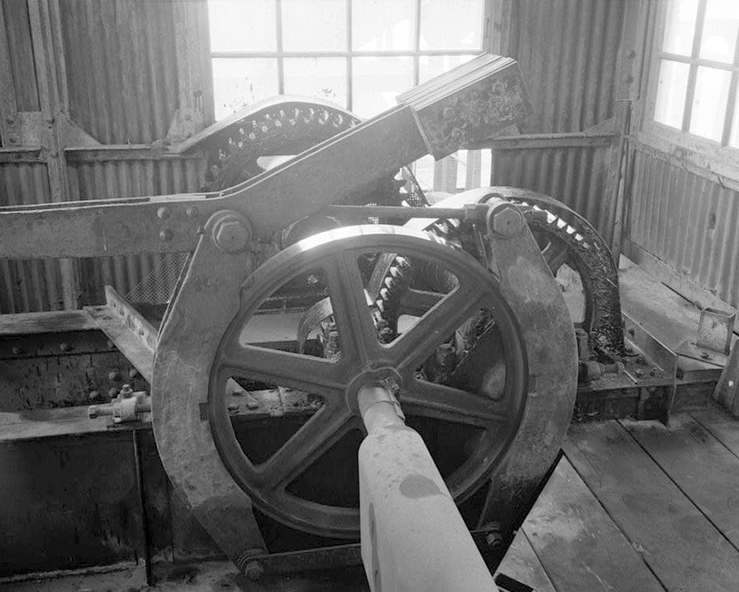54. West emergency brake in the south machinery room (interior of both machinery rooms is identical). Facing west. - Henry Ford Bridge, Spanning Cerritos Channel, Los Angeles-Long Beach Harbor, Los Angeles, Los Angeles County, CA