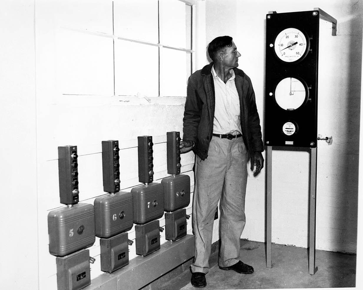 12. INTERIOR VIEW OF TRANSFORMER BUILDING, HIGHLINE PUMP PLANT, SHOWING NEW SWITCHES AND METERS, December 3, 1952 - Highline Canal & Pumping Station, South side of Salt River between Tempe, Phoenix & Mesa, Tempe, Maricopa County, AZ