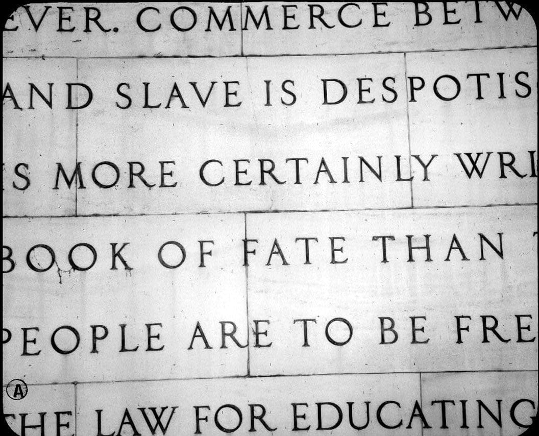 67. Detail of northeast panel (bronze letters). Mark Schara, photographer; 16 July 1992. - Jefferson Memorial, East Potomac Park, Washington, District of Columbia, DC