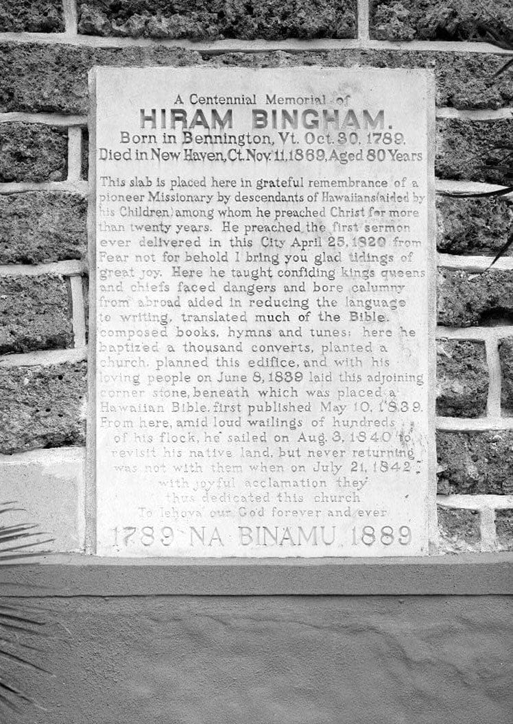 9. MEMORIAL TABLET TO HIRAM BINGHAM, NORTH CORNER OF WEST ELEVATION - Kawaiahao Church, Punchbowl & King Streets, Honolulu, Honolulu County, HI