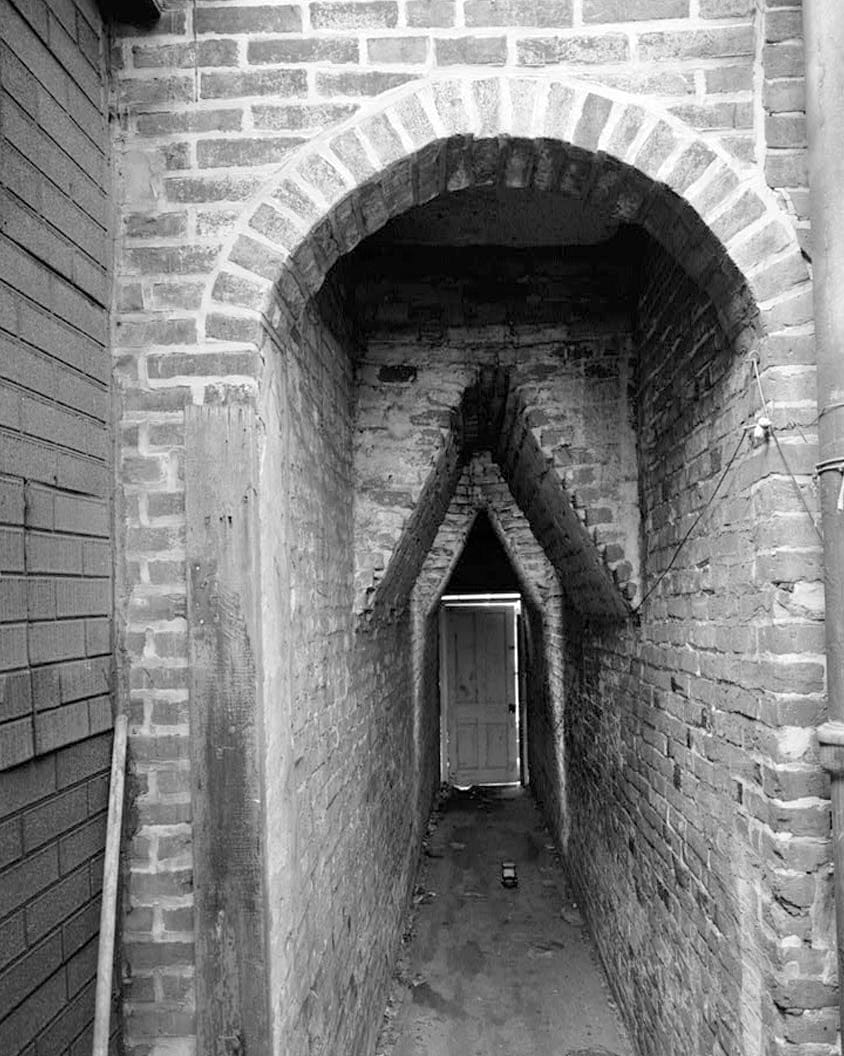 4. INTERIOR VIEW NORTHWEST, ALLEYWAY PASSAGE BETWEEN 216 AND 218 KING STREET SHOWING MASONRY ARCHED CONSTRUCTION SUPPORTING UPPER STORIES - King Street, 200 Block, 216 King Street (Commercial Building), Wilmington, New Castle County, DE