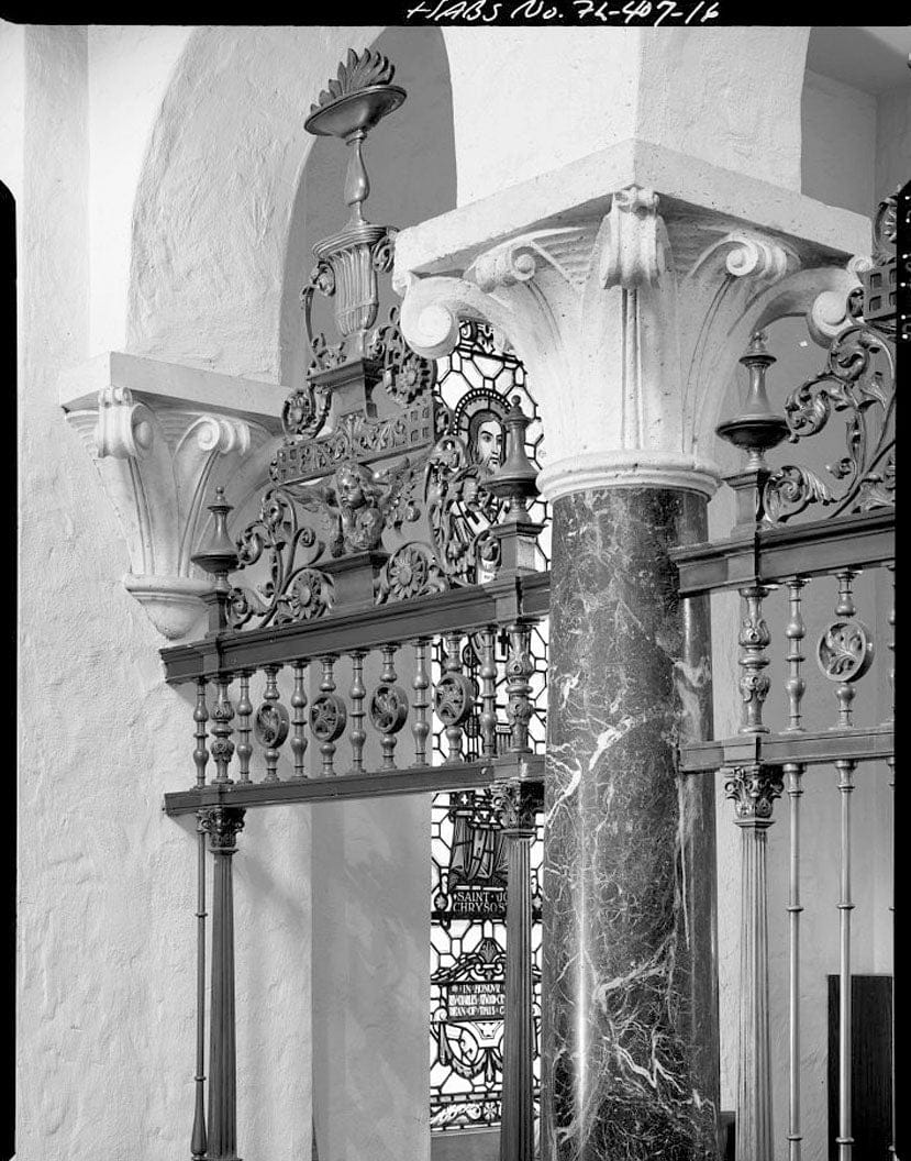 DETAIL - COLUMN AND METAL WORK. ST. FRANCES CHAPEL CAN BE SEEN BEHIND (CAMERA DIRECTION - SOUTH). - Knowles Memorial Chapel, 1100 Holt Avenue, Winter Park, Orange County, FL