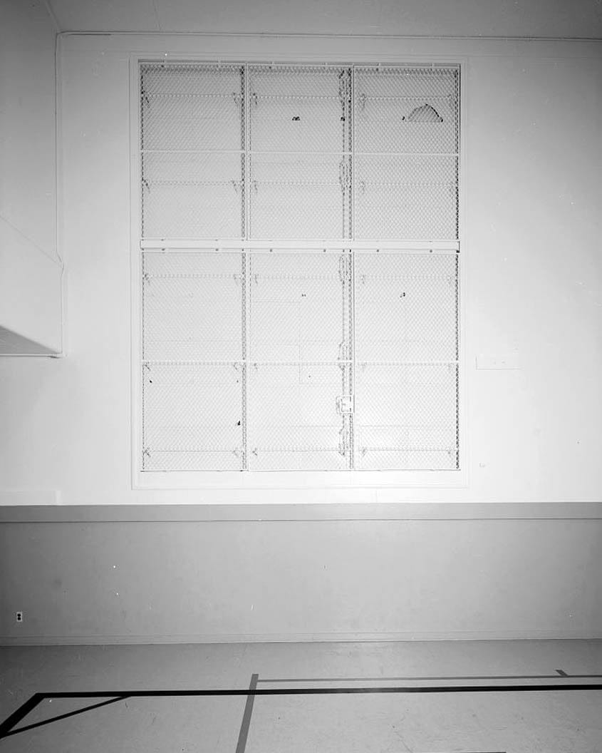 17. LARGE WINDOWS ON NORTH WALL. THE PROTECTIVE WIRE ON THE INTERIOR CAN BE SEEN. THE WINDOWS HAVE BEEN BOARDED OVER THE EXTERIOR - Kodiak Naval Operating Base, Gymnasium, U.S. Coast Guard Station, Kodiak, Kodiak Island Borough, AK