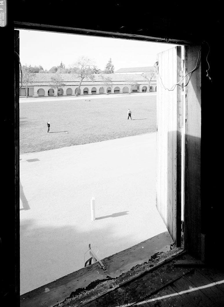 View of south-west bay loft door looking north-west towards mission. - Livery-Plaza Stable, San Juan Bautista, San Benito County, CA