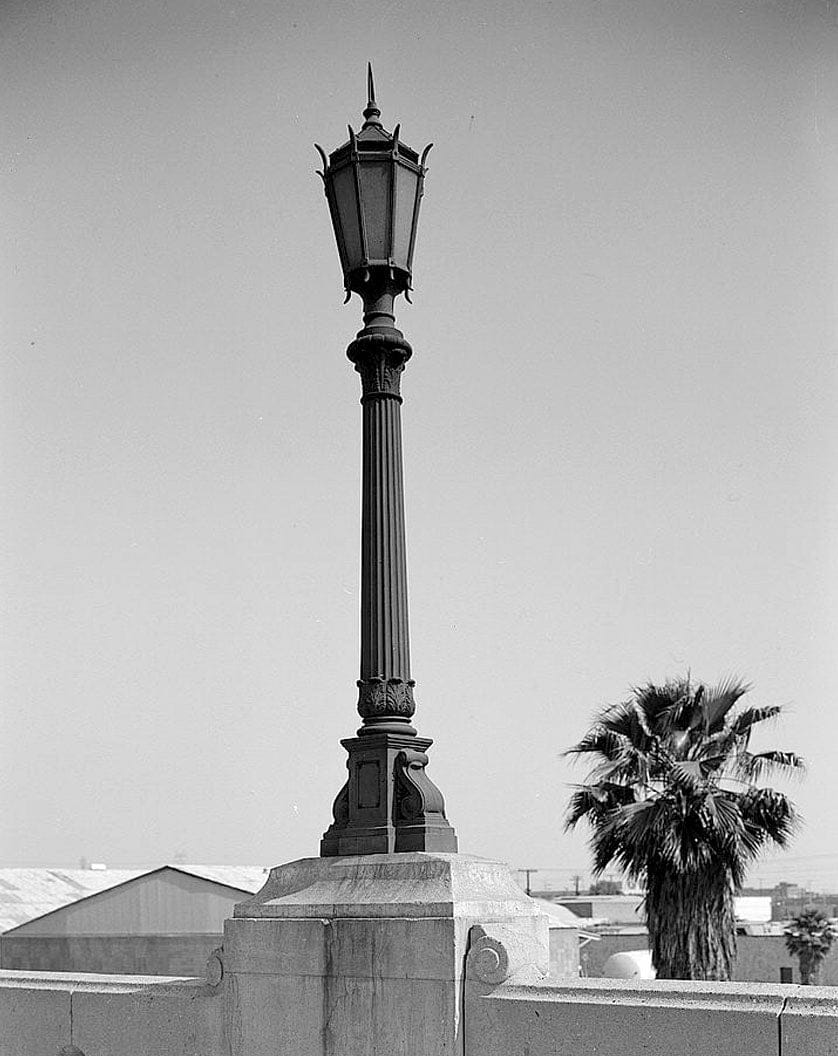37. VIEW TO SOUTHEAST; DETAIL, SOUTH RETAINING WALL ELECTROLIER (Asano) - Los Angeles Union Passenger Terminal, Mail, Baggage, & Express Building, 800 North Alameda Street, Los Angeles, Los Angeles County, CA